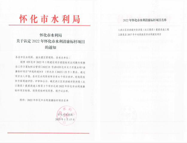 近日,从怀化市水利局传来消息,星空app官方站官网(洪江区巫西城市防洪堤沅江路段提质改造工程)喜获“2022年度怀化市水利清廉标杆项目”荣誉,清廉建设取得明显成效和充分认可。